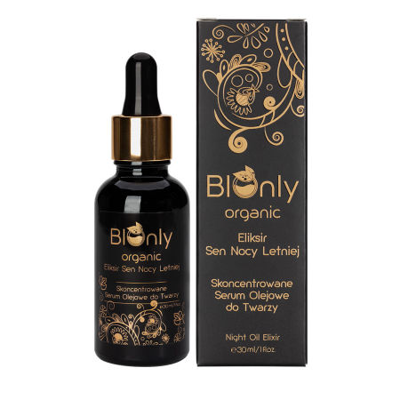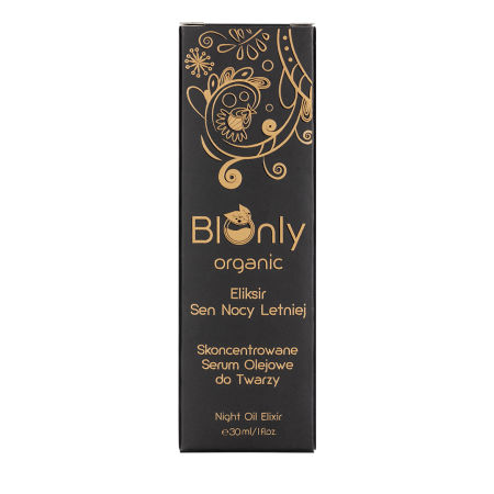 Eliksir Sen Nocy Letniej BIOnly organic zawiera koncentrat zimnotłoczonych olejów: ze słodkich migdałów, jojoba, arganowego oraz z pestek winogron, których zadaniem jest wygładzenie i uelastycznianie skóry, poprzez silne działanie antyoksydacyjne. Ochrona struktur skóry wynika z właściwości olei, obecności witaminy E oraz bogactwa ekstraktów kwiatowych z jaśminu, piwonii, wiśni Japońskiej, gorzkiej pomarańczy, lawendy, czarnego bzu i róży Damasceńskiej. Serum pięknie rozświetla i poprawia koloryt skóry, działa nawilżająco i łagodząco.